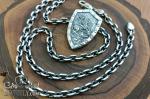 Стильний срібний набір, що включає підвіску у формі щита з Георгієм Побєдоносцем та чоловічий якірний ланцюжок. Центральний елемент – рельєфна підвіска з деталізованим сюжетом перемоги над драконом. Фактура дерева, об'ємні заклепки та виразна композиція створюють ефект історичного артефакту та підкреслюють символіку захисту та сили.