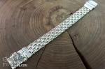 Дане плетіння відрізняється високою щільністю та багатошаровою геометрією: ланки з характерними перехресними елементами доповнені гладкими пластинами, що створюють ритмічний малюнок та посилену міцність конструкції. Полірована поверхня без покриття розкриває природний блиск срібла та чіткість форм.