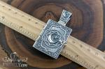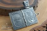 На фото зображена масивна розкладна підвіска з левом та півмісяцем із зіркою зі срібла 925 проби з чорнінням виконана у формі мініатюрної книги-складня, що поєднує символіку сили, віри та захисту. Конструкція на шарнірі відкривається, розкриваючи декоративно оформлені внутрішні панелі з рельєфними написами та орнаментами.
