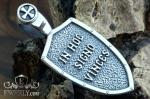 На звороті розміщено напис IHS SIGNO VINCES — християнський символ перемоги віри та духовної опори. Рельєфний текст гармонійно поєднується із зернистою фактурою фону та рамкою, стилізованою під укріплений щит із декоративними заклепками. Вушко прикрашено хрестом та виконано в єдиній стилістиці виробу.